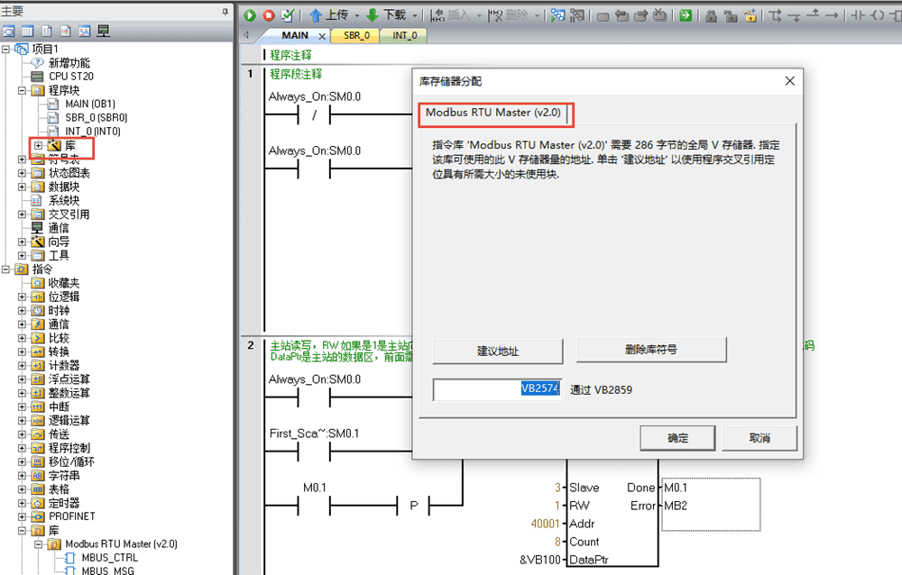 Modbus RTU的主站这样就算写好了,对库地址进行分配;库地不能与程序中的其它变量进行冲突。