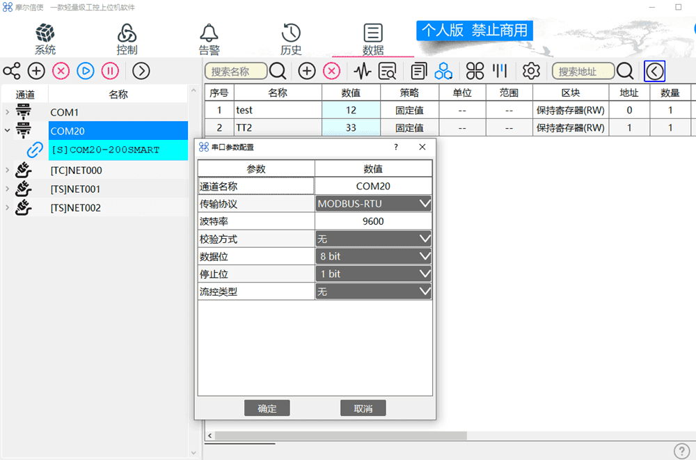 本次案例的环境是200 SMART与电脑中的MThings摩尔信使的Modbus RTU通讯;