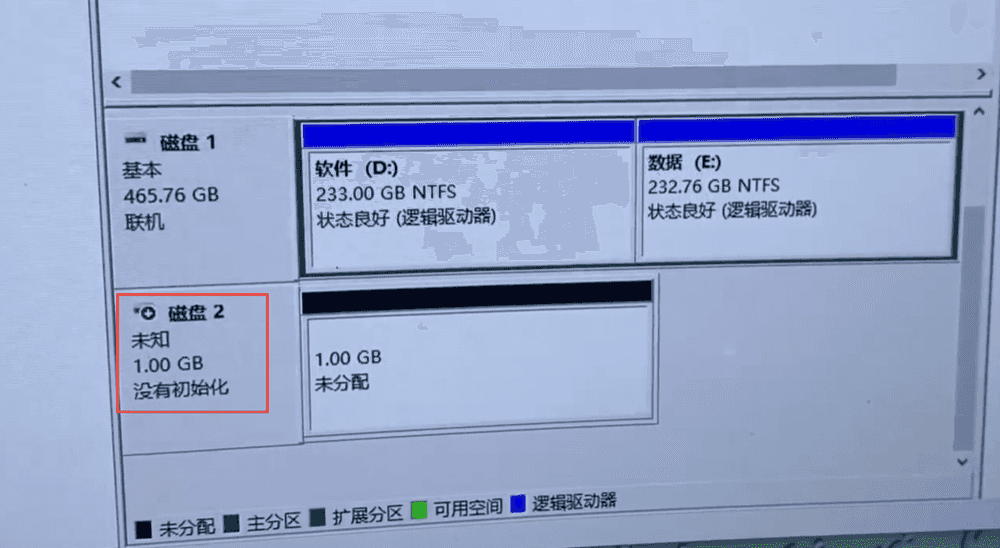 计算机管理------磁盘管理------当显示磁盘x未知,没有初始化就说明短接成功了。