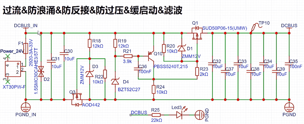 - Q10和Q1是防过压和缓启动电路,正常情况下D4是27V稳压,24V的电源它是不工作的,Q10不工作,24V经R20、R23、R24分压在Q1的G极产生13V左右的电压,此时Ugs就有11v左右的压差,Q1的DS就导通了。