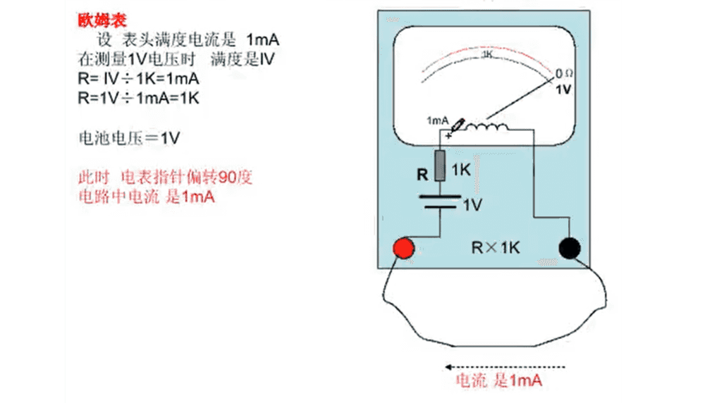 被测电阻等于欧姆表的内阻,指针指示45度(满刻度的一半)这就是中心刻度,此值越小越好。中心刻度越小测量精度越高,表笔间的电流更大。