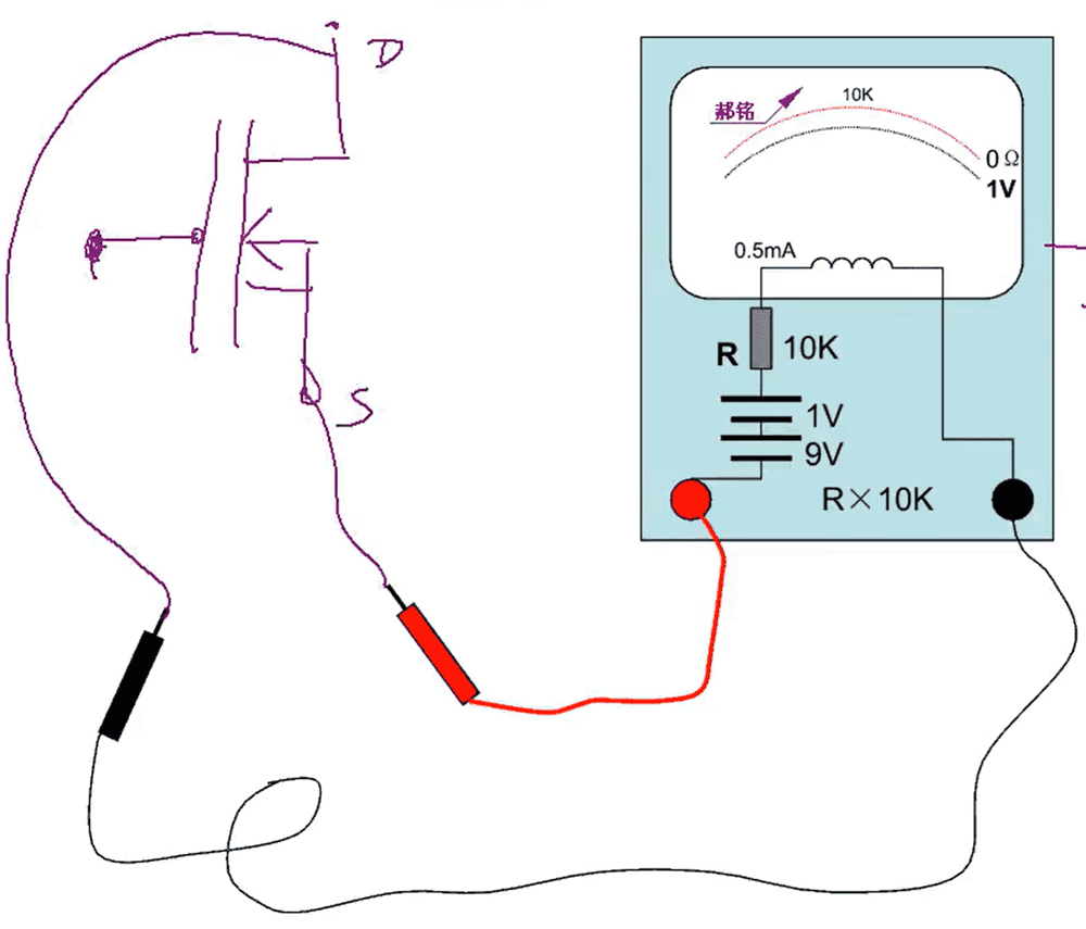 MOS管只能用RX10K档测量,以NMOS为例,用RX10K档将黑笔接D,红笔接S极此时应不动没有任何变量,此时有电阻或用手摸将D极10.5V电加到G极,此时DS就导通了,将G极撤掉仍然导通纹丝不动,说明是好的;如果撤掉后指针变化说明GS漏电了;。