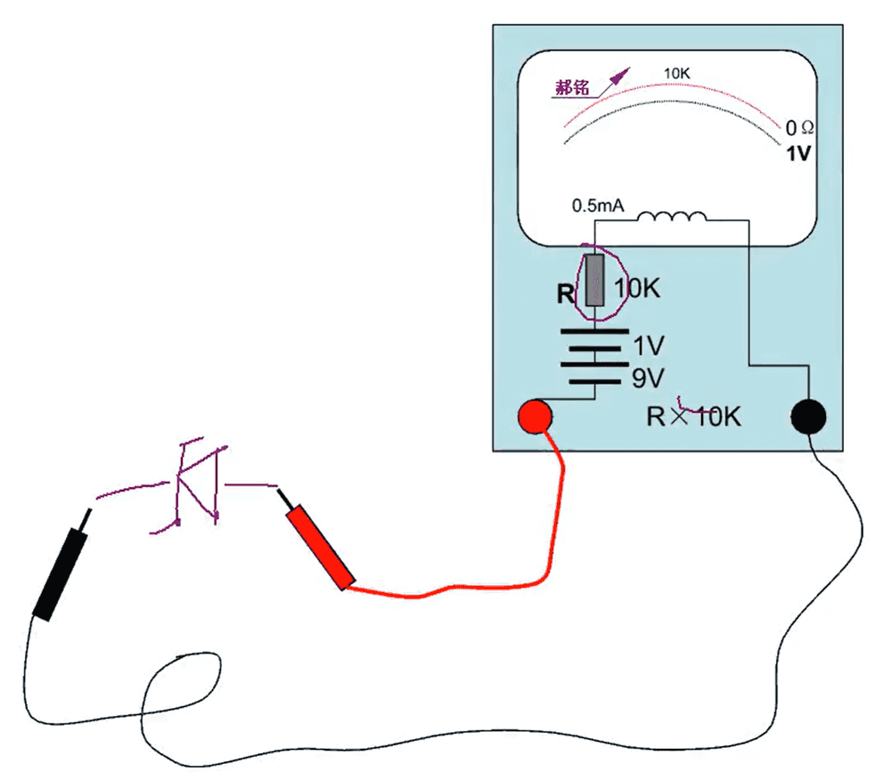 RX1档是大电流,适合测二极管的正向导通特性,因为二极管的软损坏就是PN结的导通能力变弱了,比如本来能导能100mA的电流,因受损只能导能1mA的电流了。如MF500,MF47型正向一般在20欧姆左右。