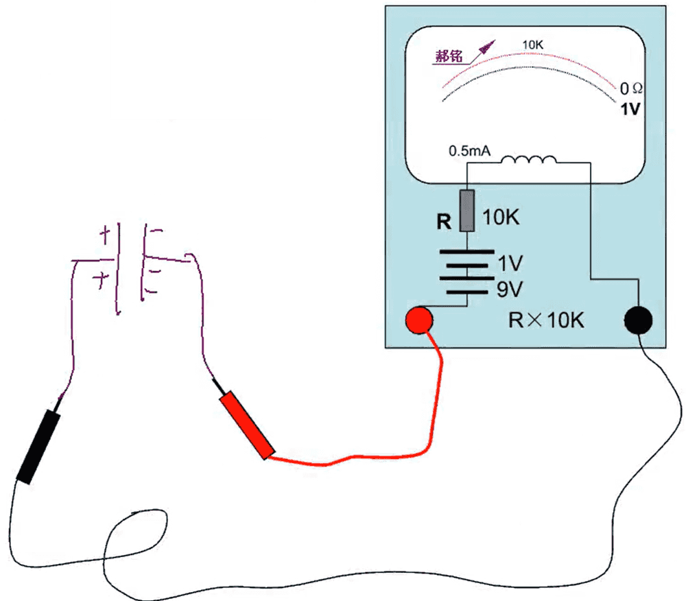 电解电容的特性它有正负极,如果黑笔接电容的正,红笔接电容的负此时极化最强不漏电,如果反表笔对换,极化电压是反的,击穿漏电;针指表用RX100或RX10K档进行测量,不能用RX1档了。