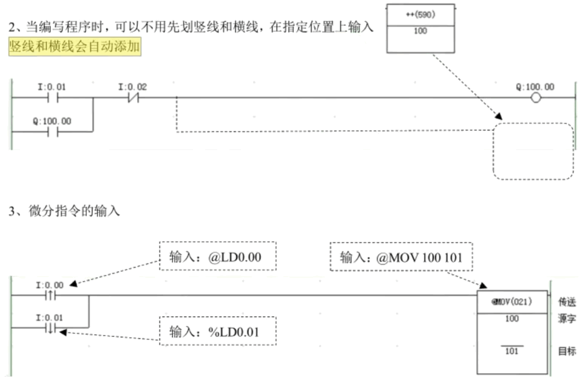 编程时坚线(Ctrl+上下箭头)和横线(Ctrl+左右箭头)的自动添加,上升沿(选中符号按@),下降沿(选中符号按%)的输入,微分指令的输入。