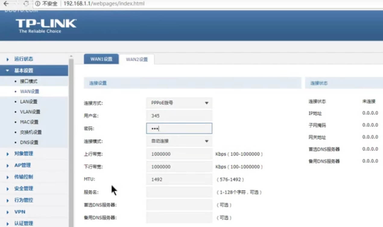 进入管理器器 192.168.1.1 WAN口的配置,如果是双WAN口也都要进行配置