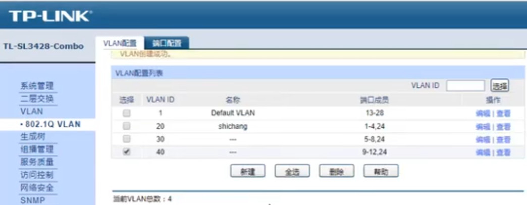 进入三层交换机的管理界面配置VLan;分别配VLan10几个口,VLan20几个口,VLan30几个口,VLan40几个口,其它的都留给默认了。