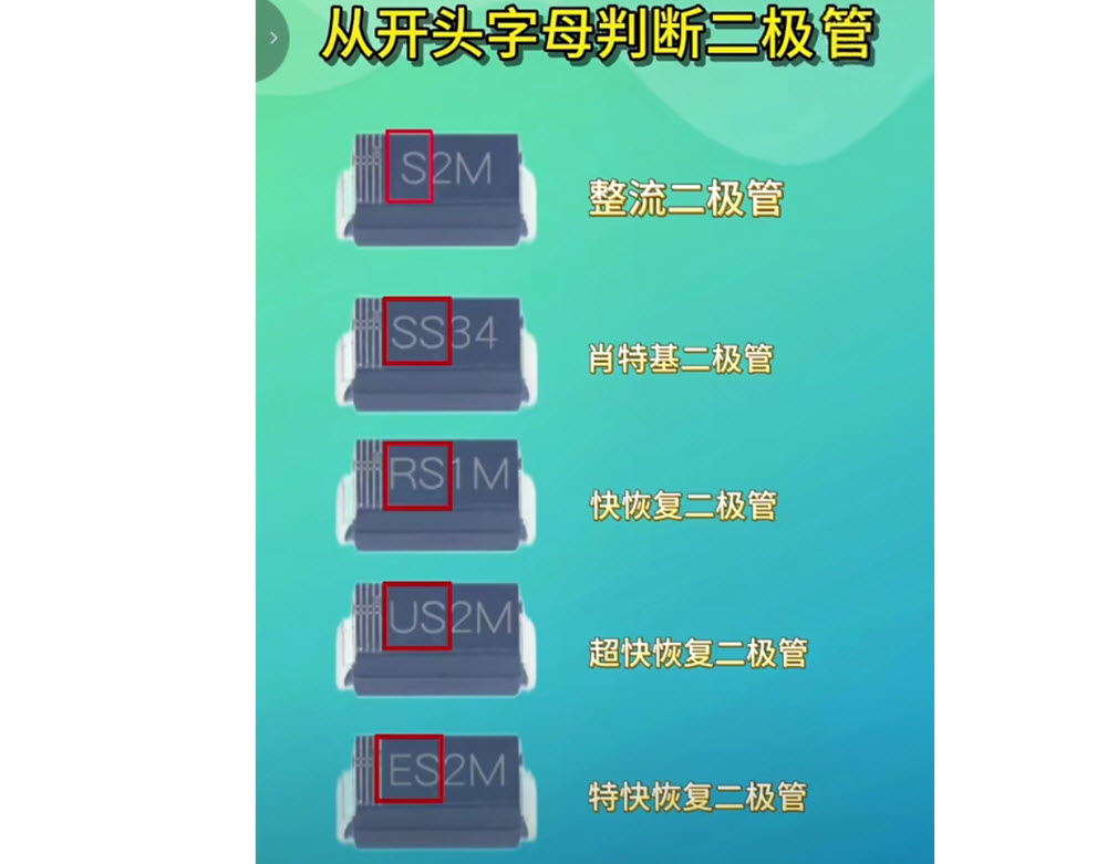可以通过字母的开头来判断是肖特基二极管,快恢复二极管,超快恢复二极管,特快恢复二极管。