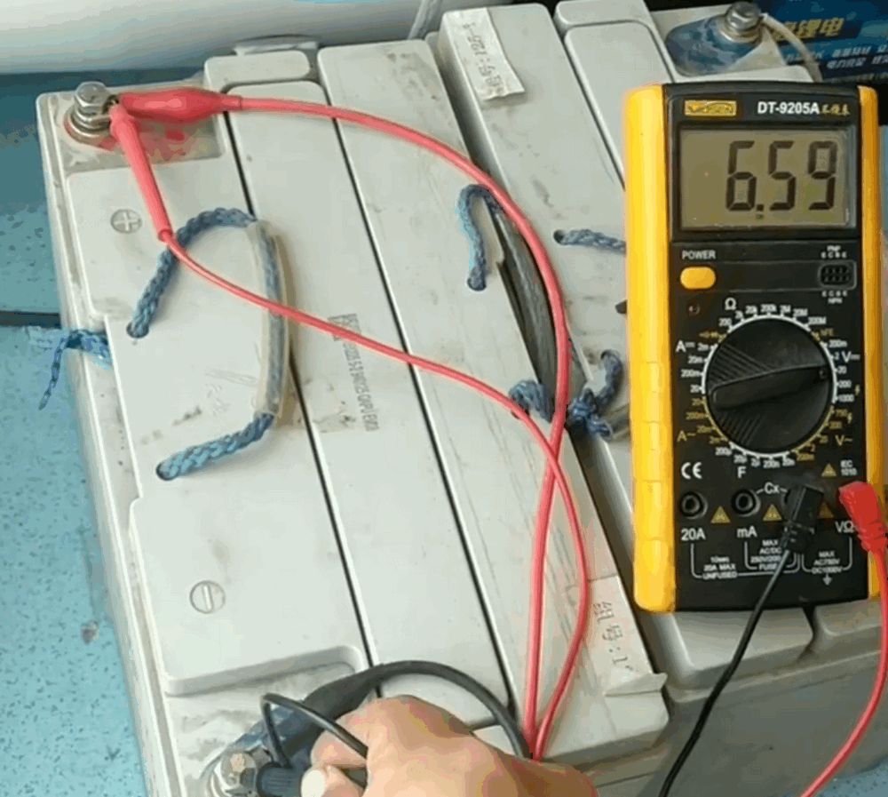 这块只有6.59V的电池接上72V的锂电池充电器,此时测电池两端的压在10V左右来回跳动,这是因为锂电池的充电器是恒压恒流的对电池进行充电。这种方法可以叫做超压强制充电法,目的是让它达到9V以上。然后再改用12V普通充电器进行正常充电。每一块都如此操作。充电时间可能会比较长,但是经过激活之后大部分电池都能够恢复正常使用。