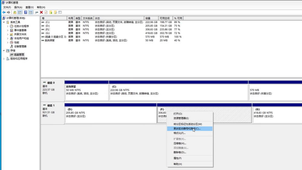 可击"此电脑"点击"管理"在磁盘管理中在需要更改驱动器号的地方右击,更改驱动器号和路径…