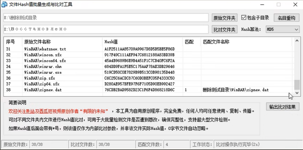 通过Hash值批量生成对比工具。可以检测恢复出来的数据与原数据是否一致,不可能一一打开进行验证啊!Hash对比式具