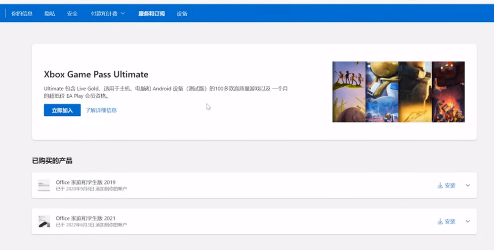 点击"服务和订阅"后拉到最下方就会显示已购买的office产品。购买过两台电脑赠送的office就应有两个。