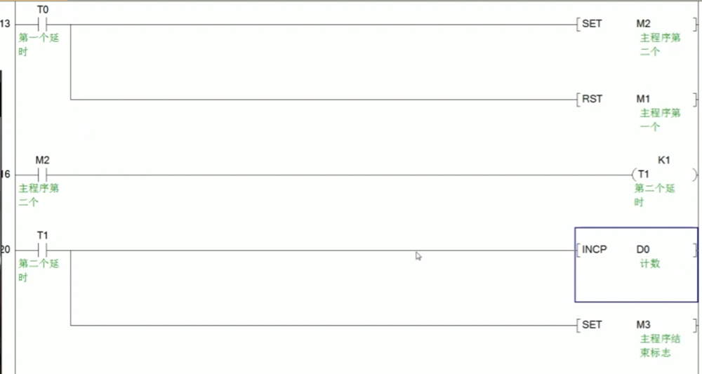 【4】当急停开启后关闭正在使用的M点,除报警,手动自动及当前的急停标志M900的M点外,关闭全部的输出,除当前正在使用的Y007外,清空所有的D寄存器和计数器。