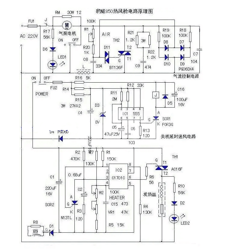 此款是老式的850A没有温度和风量显示的热风枪,由气流控制电路,关机延时送风电路,温度控制电路三部分组成,