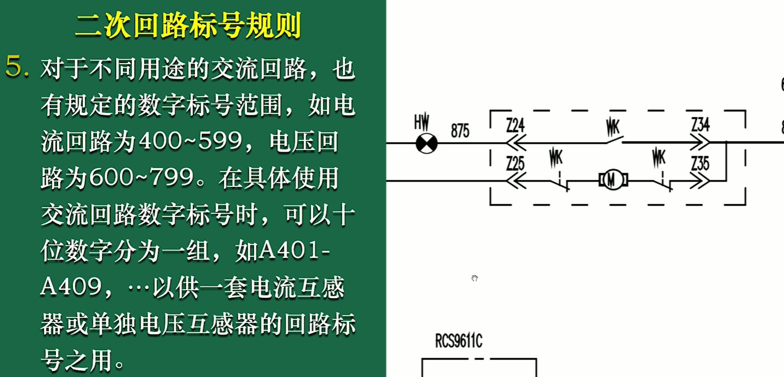 - 直流回路和交流回路用不同的标号方法,而在交,直流回路中,对各种不同的回路又赋予不同的数字符号。因此,在二次回路接线图中,只要看到标号,就能知道这一回路的性质而便于维护和检修。