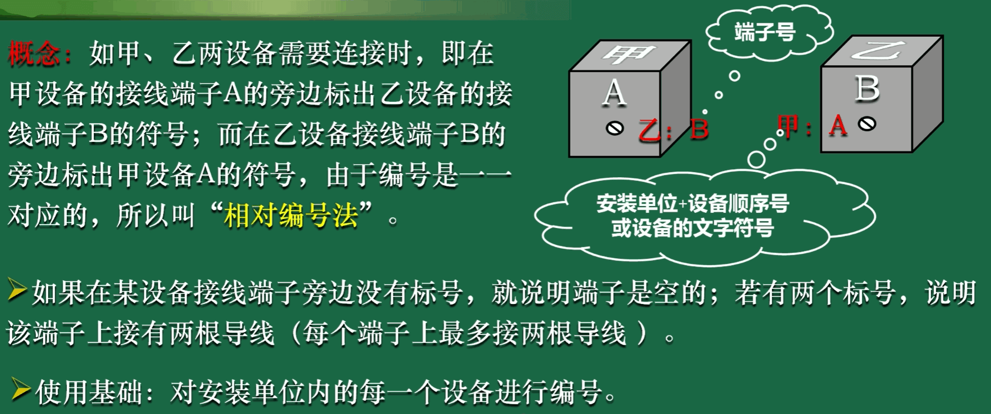 - 凡是各设备间要用控制电缆经端子排进行连接的连接导线,都要按回路编号原则进行编号。