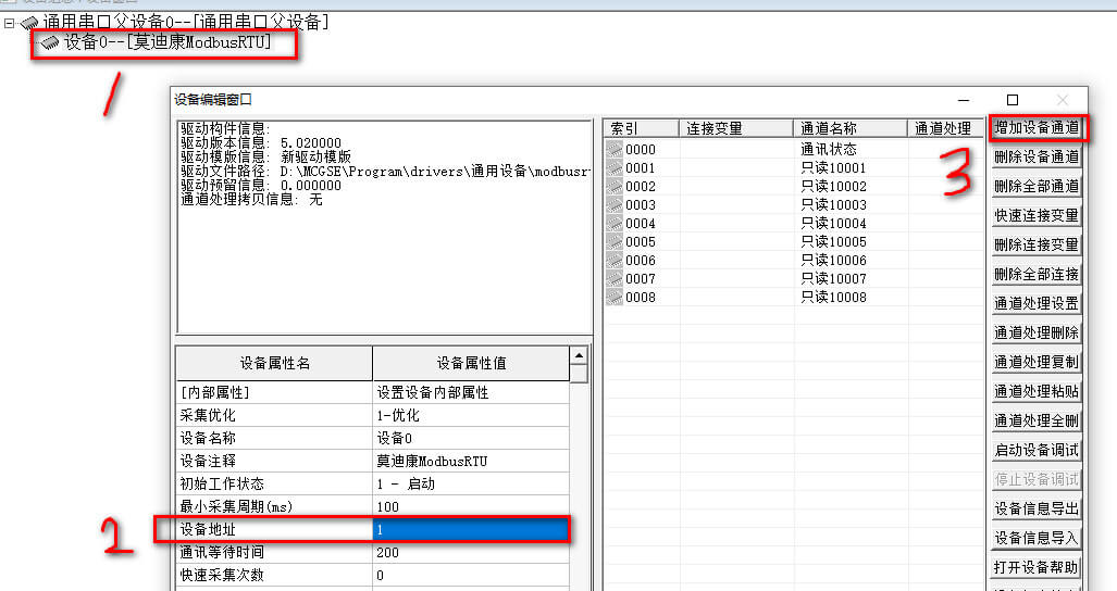 注:不管有多少台设备,通用串口父设备只需要调用一次。有几台设备就调用几次莫迪康ModbusRTU几次。